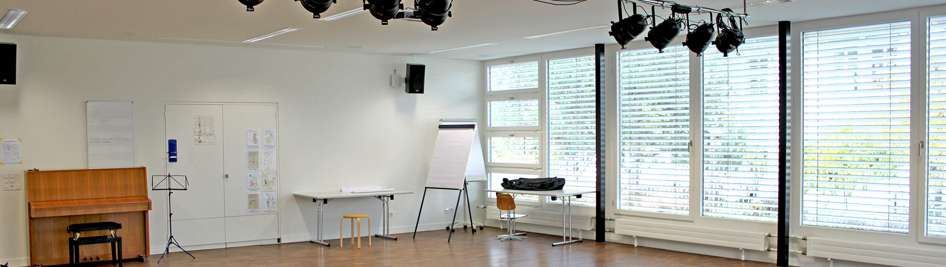 Der Singsaal verfügt über eine Theaterbeleuchtung, einen Beamer und eine Musikanlage. 8 Tische (160/80 cm) und 100 Stühle stehen zur Verfügung.