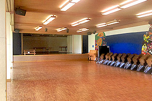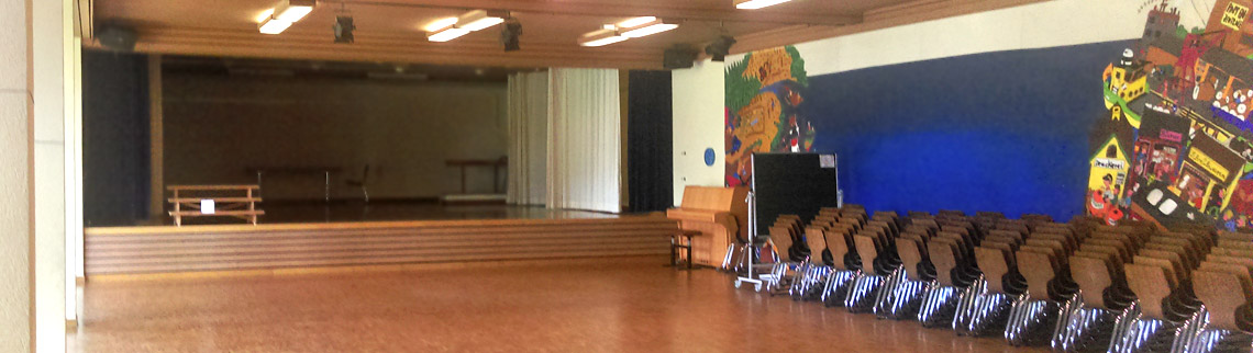 Der Singsaal verfügt über eine Bühne, Theaterbeleuchtung, einen Beamer und eine Musikanlage. Es stehen 30 Tische (180/80 cm) und 195 Stühle zur Verfügung. Die angrenzende Küche darf genutzt werden.
